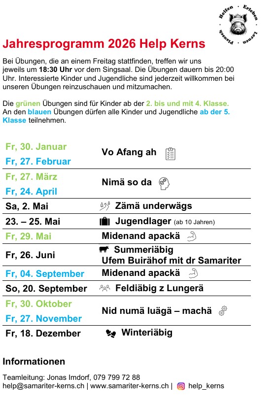 Bei Übungen, die an einem Freitag stattfinden, treffen wir uns jeweils um 18:30 Uhr vor dem Singsaal in Kerns. Bei den anderen Übungen folgen detaillierte Informationen per Email. Interessierte Kinder und Jugendliche sind jederzeit willkommen bei unseren Übungen reinzuschauen und mitzumachen.